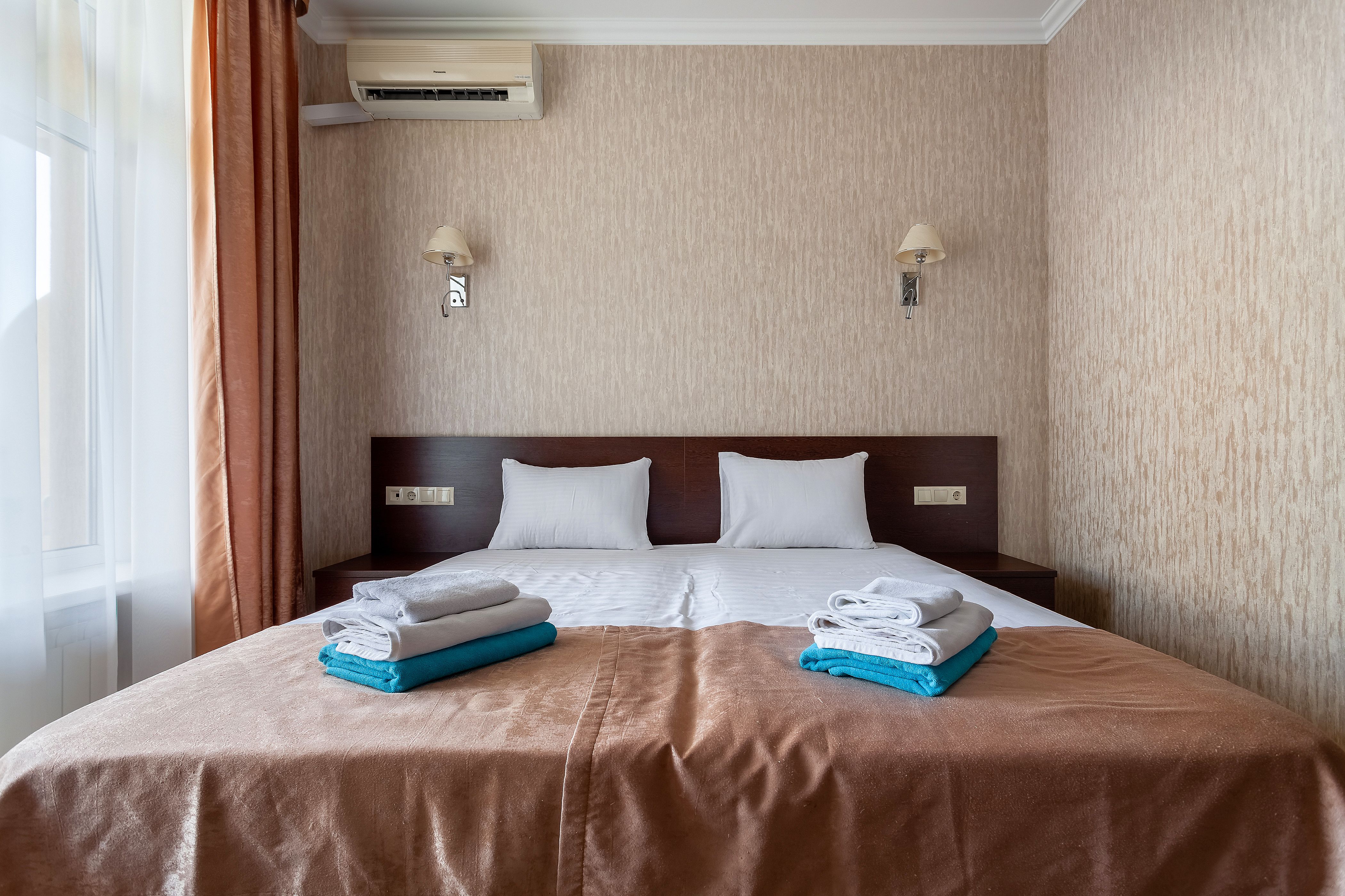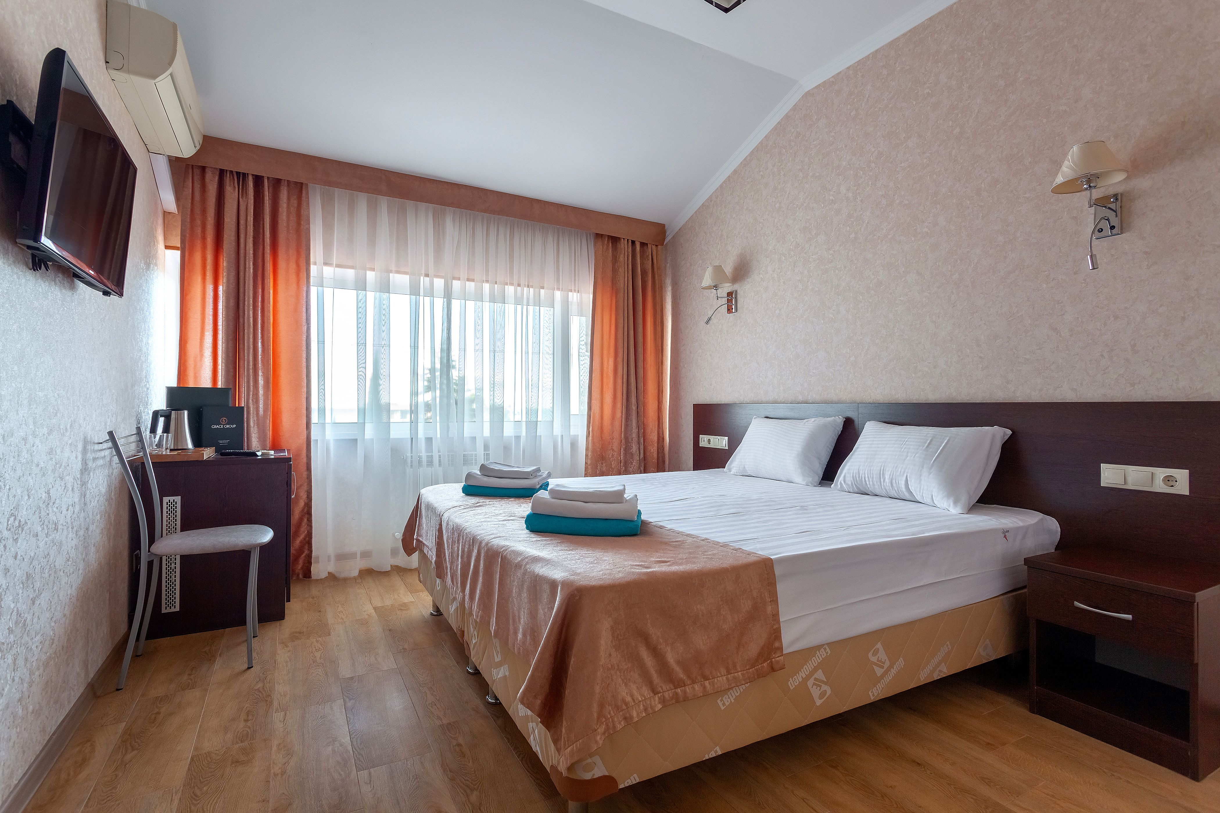 Расположение номера: Корпус 4-5 (на 5-6 этажах) Вид из номера: Вид на внешнюю часть двора, море Комнаты в номере: Спальня Кровати: 1 двуспальная или 2 односпальные Комментарии: В номере: |