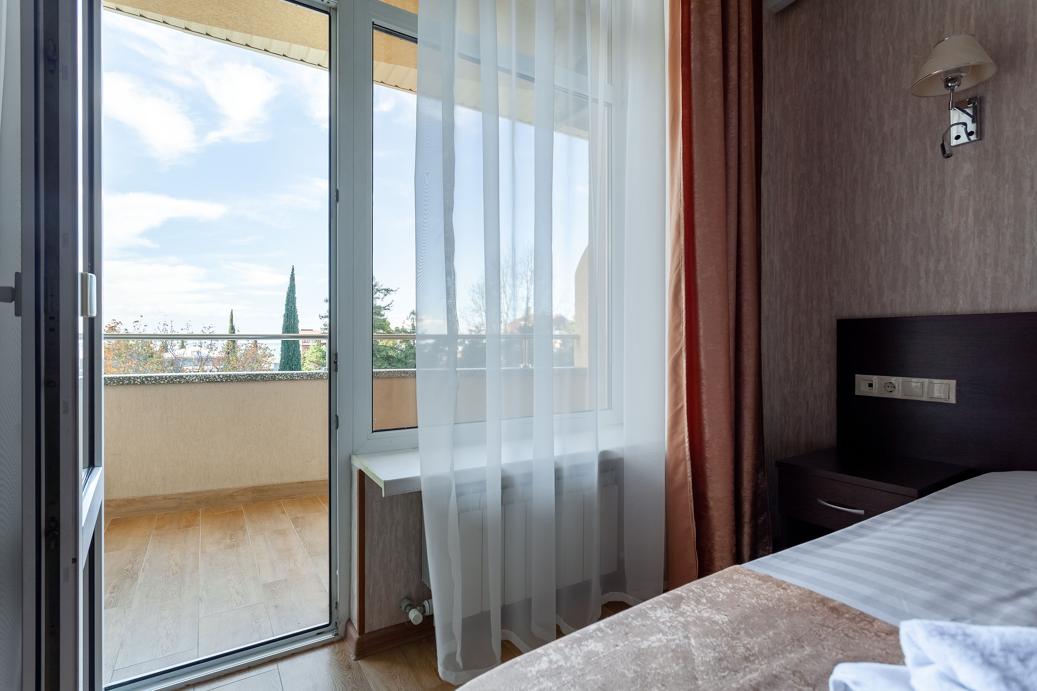 Расположение номера: 3 корпус Вид из номера: на море, на парк, во двор Комнаты в номере: Спальня и гостиная Кровати: 1 двуспальная Комментарии: "Стандарт 2 комнатный Вид на Море (Корпус 3)" - номер без дополнительного спального места. |
