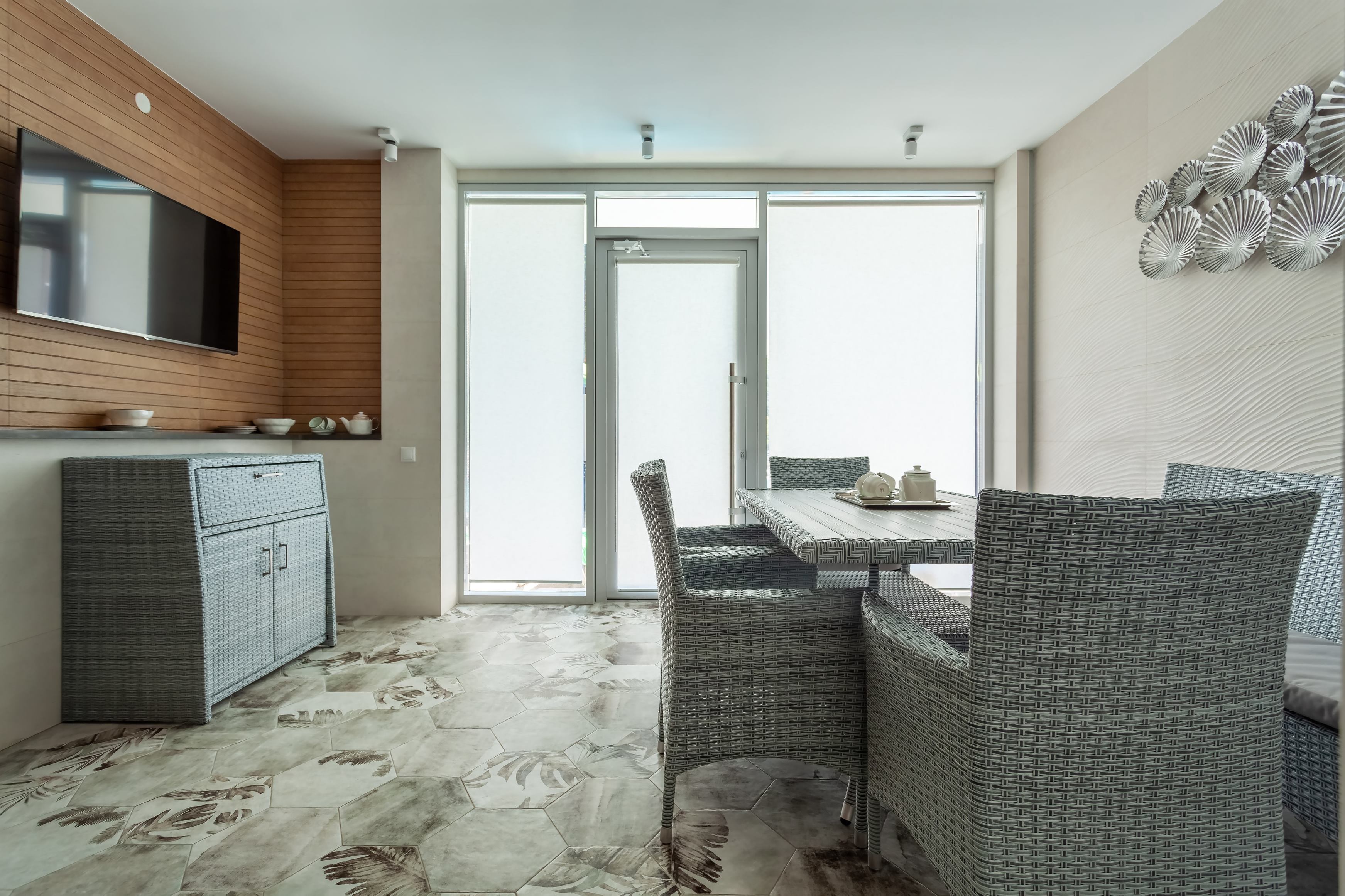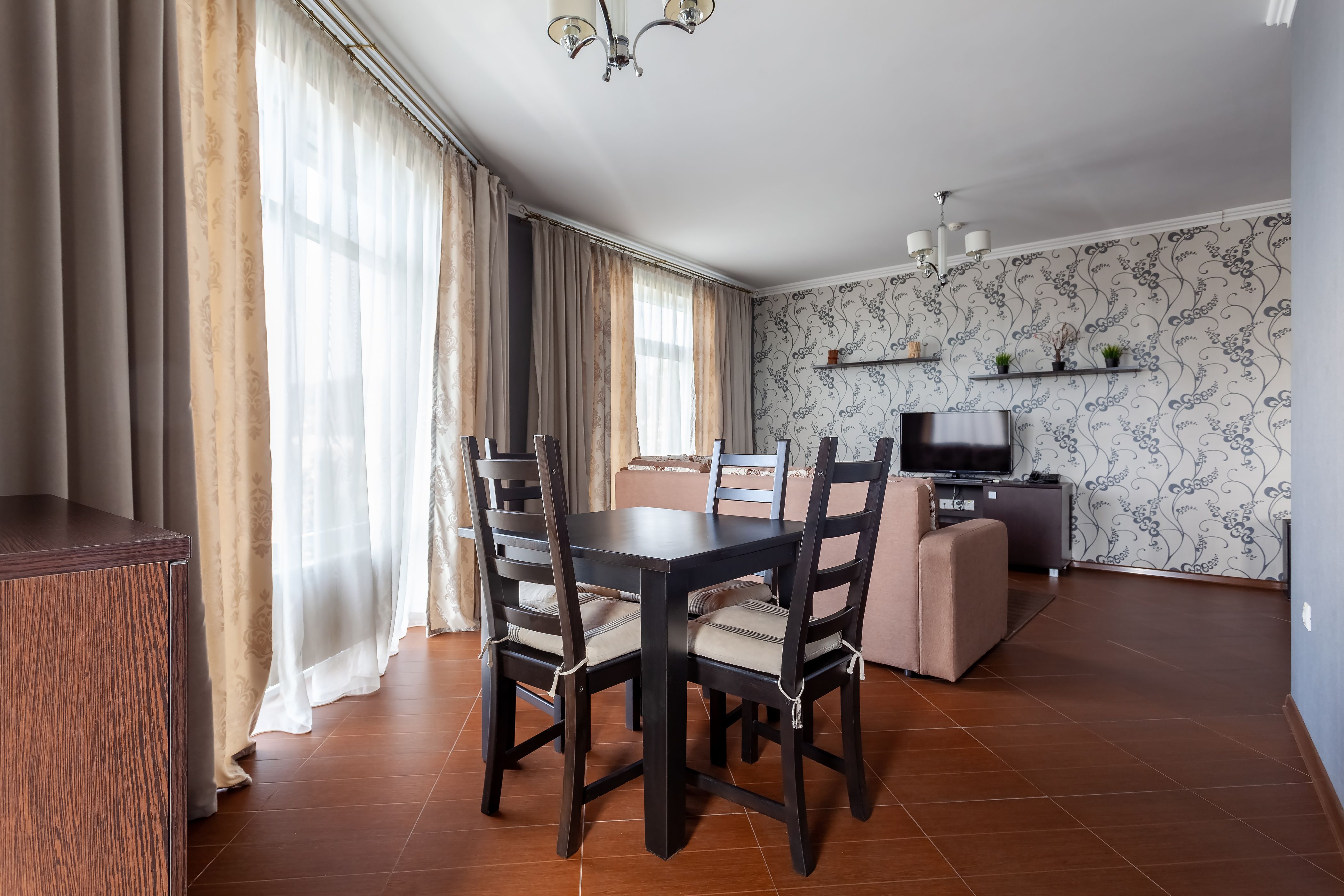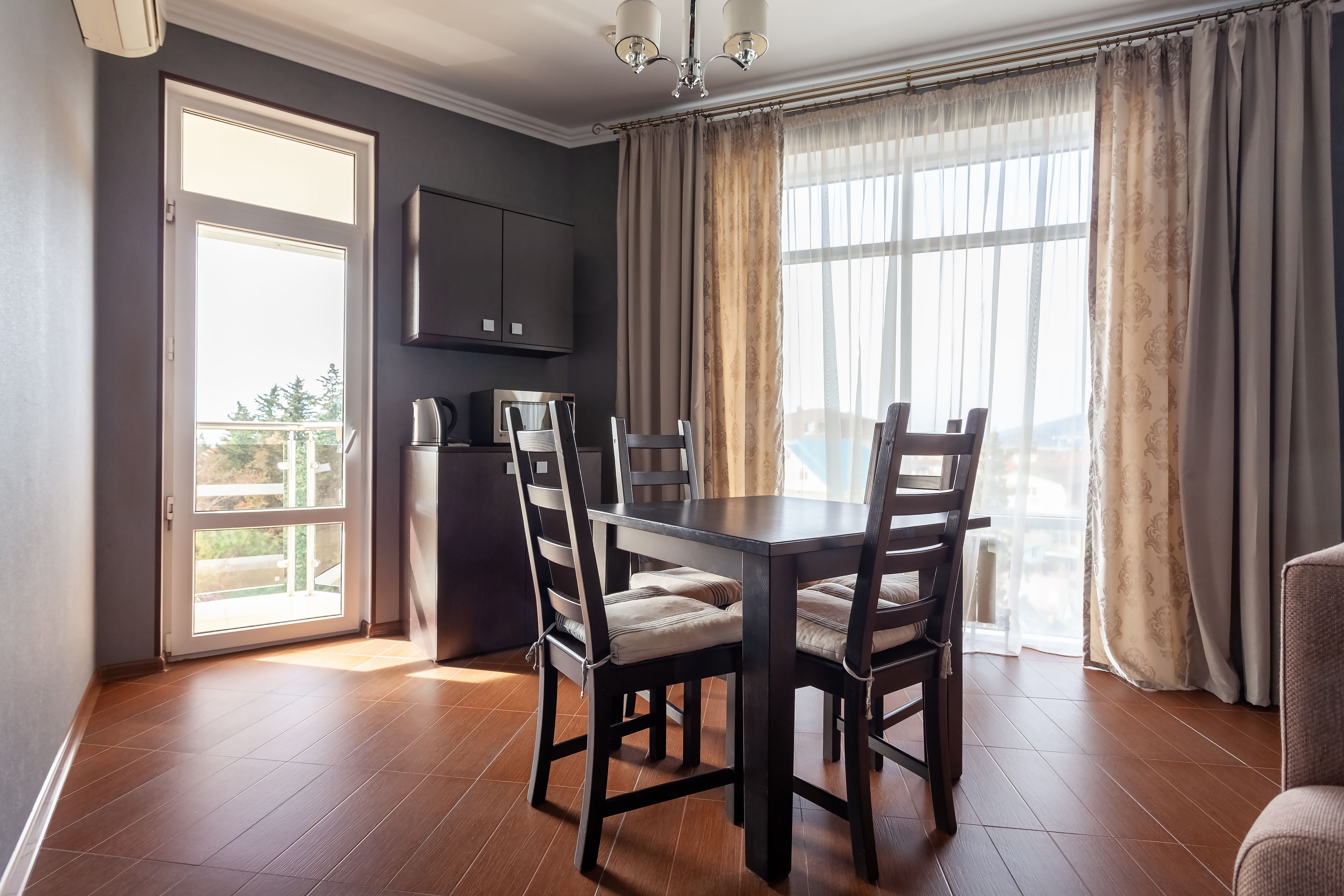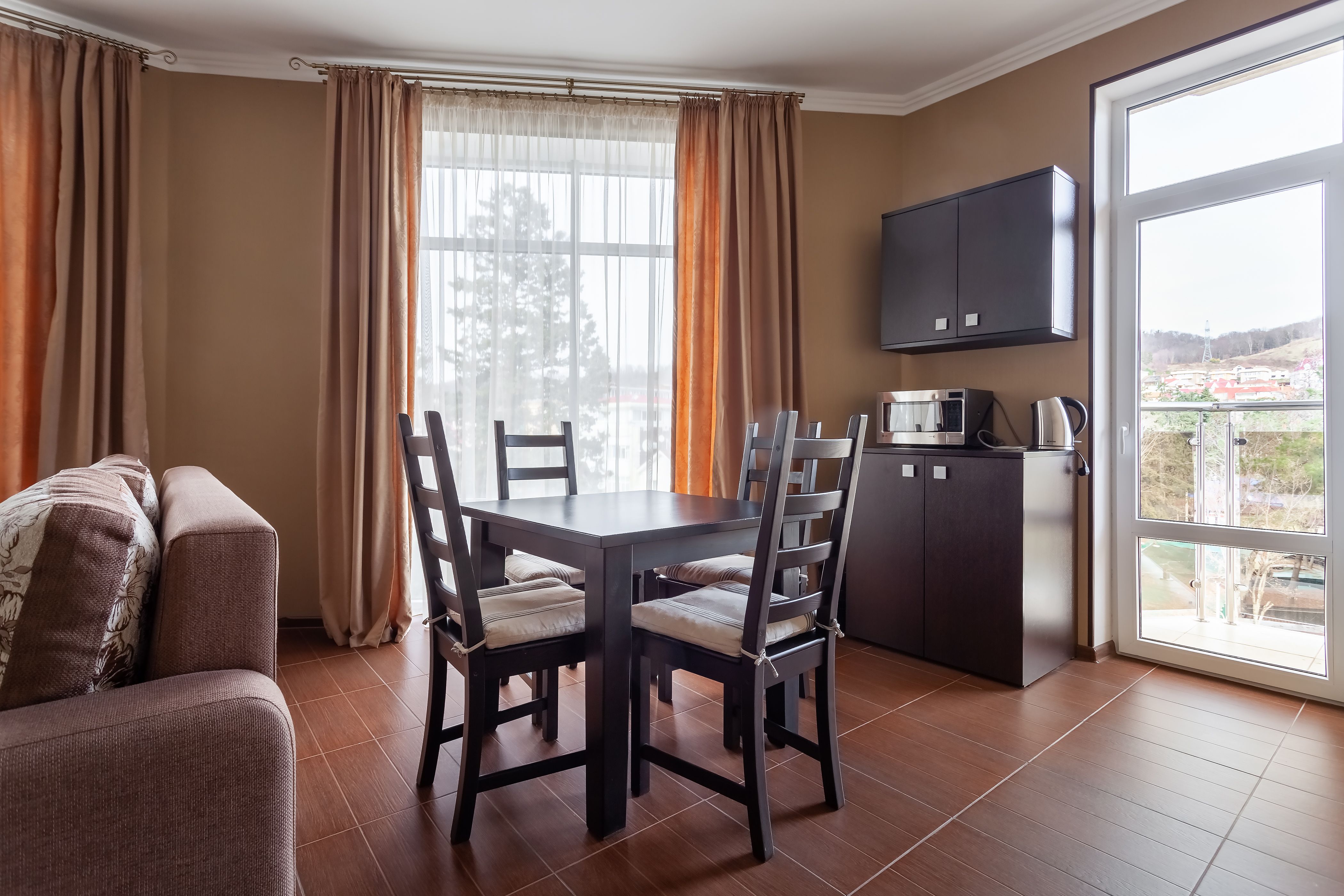 Кухонное оборудование: обеденный стол со стульями, микроволновая печь, полный комплект посуды