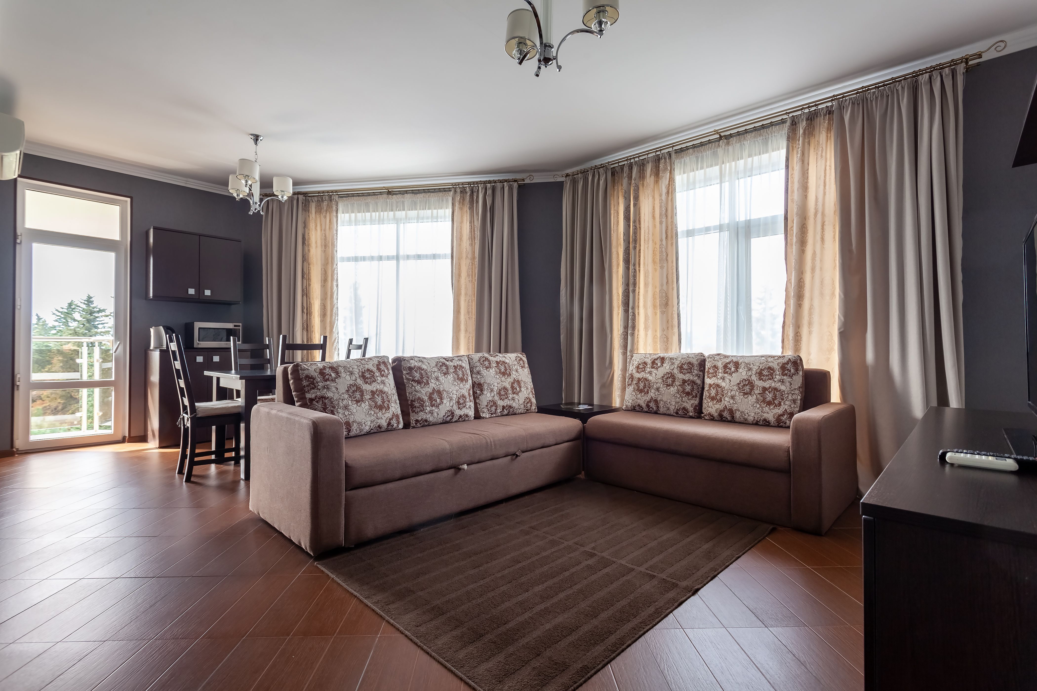 Комментарии: Трехкомнатный номер: большая гостиная со встроенной кухней, спальня и комната с диваном-кроватью.