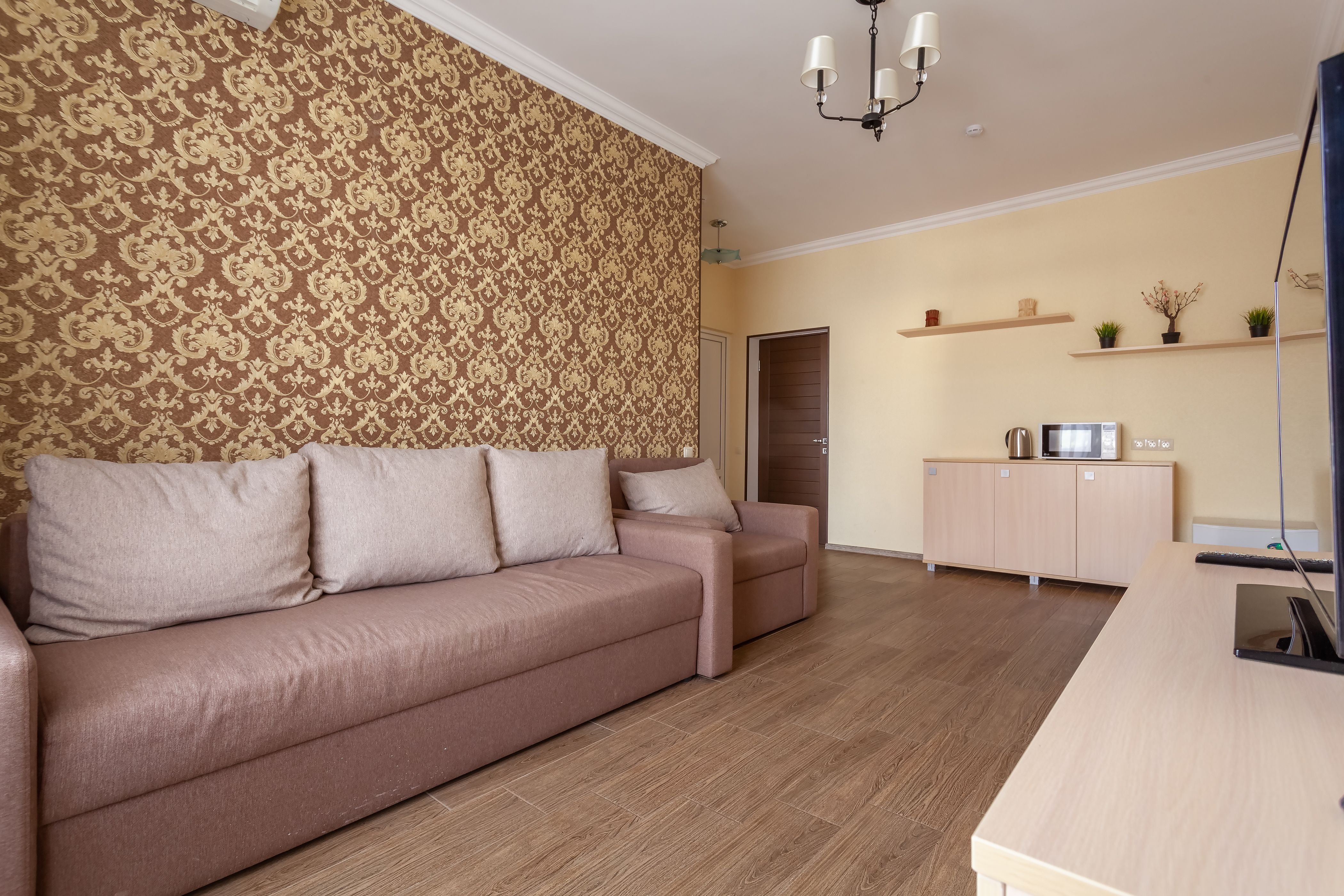 "Студия с доп местом (Корпус 1-3)" - номер с дополнительным спальным местом (диван-кровать (2 места)).
