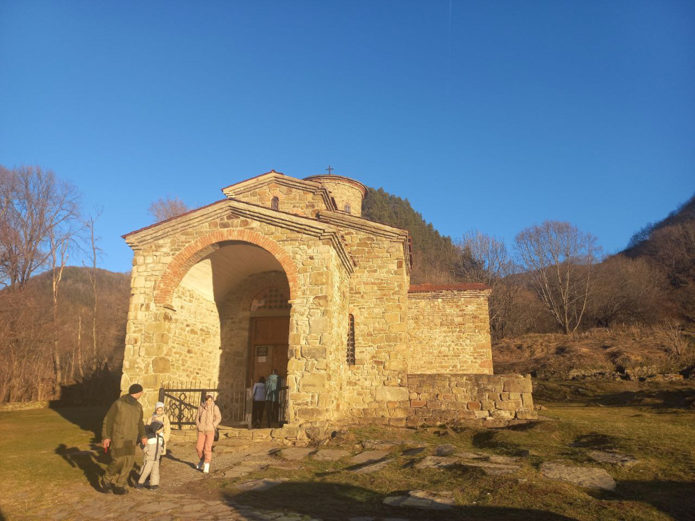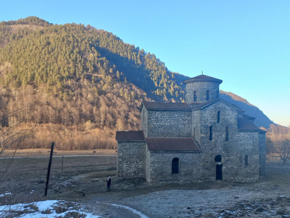 Уже в долине реки Кубань, из окон автобуса мы увидим средневековый Шоанинский храм, возвышающийся на отроге скалы.